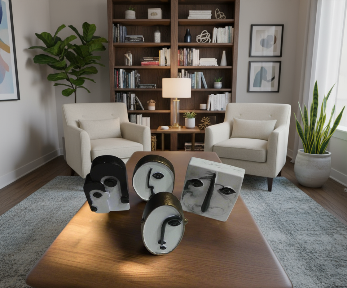 1 conjunto composto por 4 Artefatos-Faces medindo cada um em torno de 10cm X 8cm.