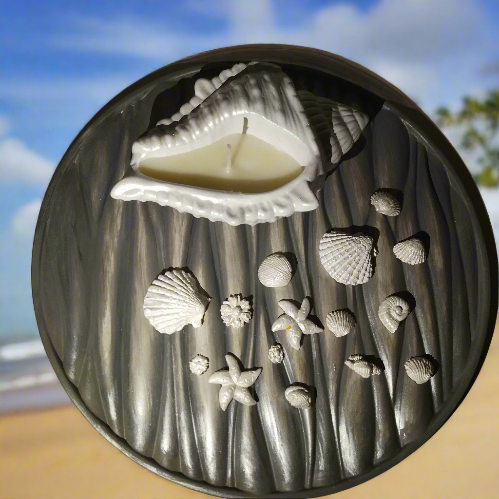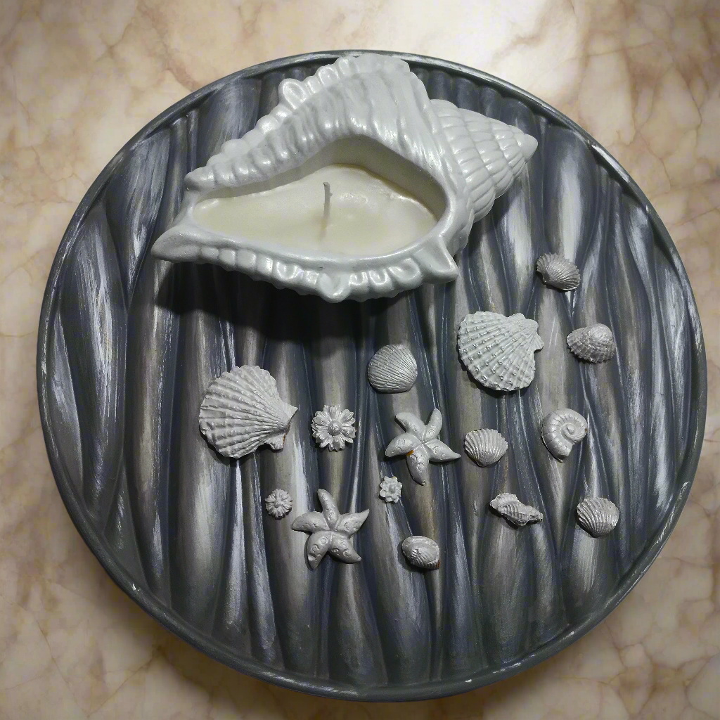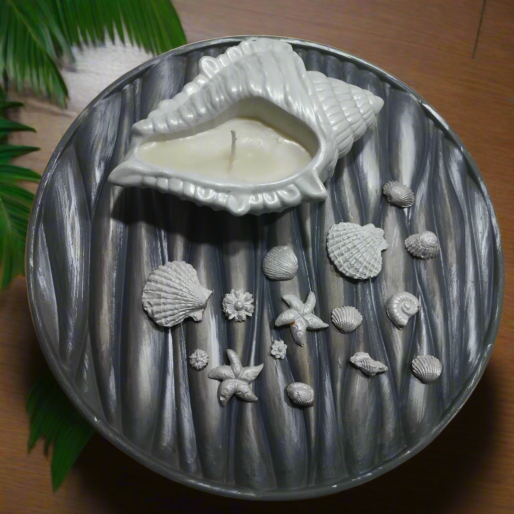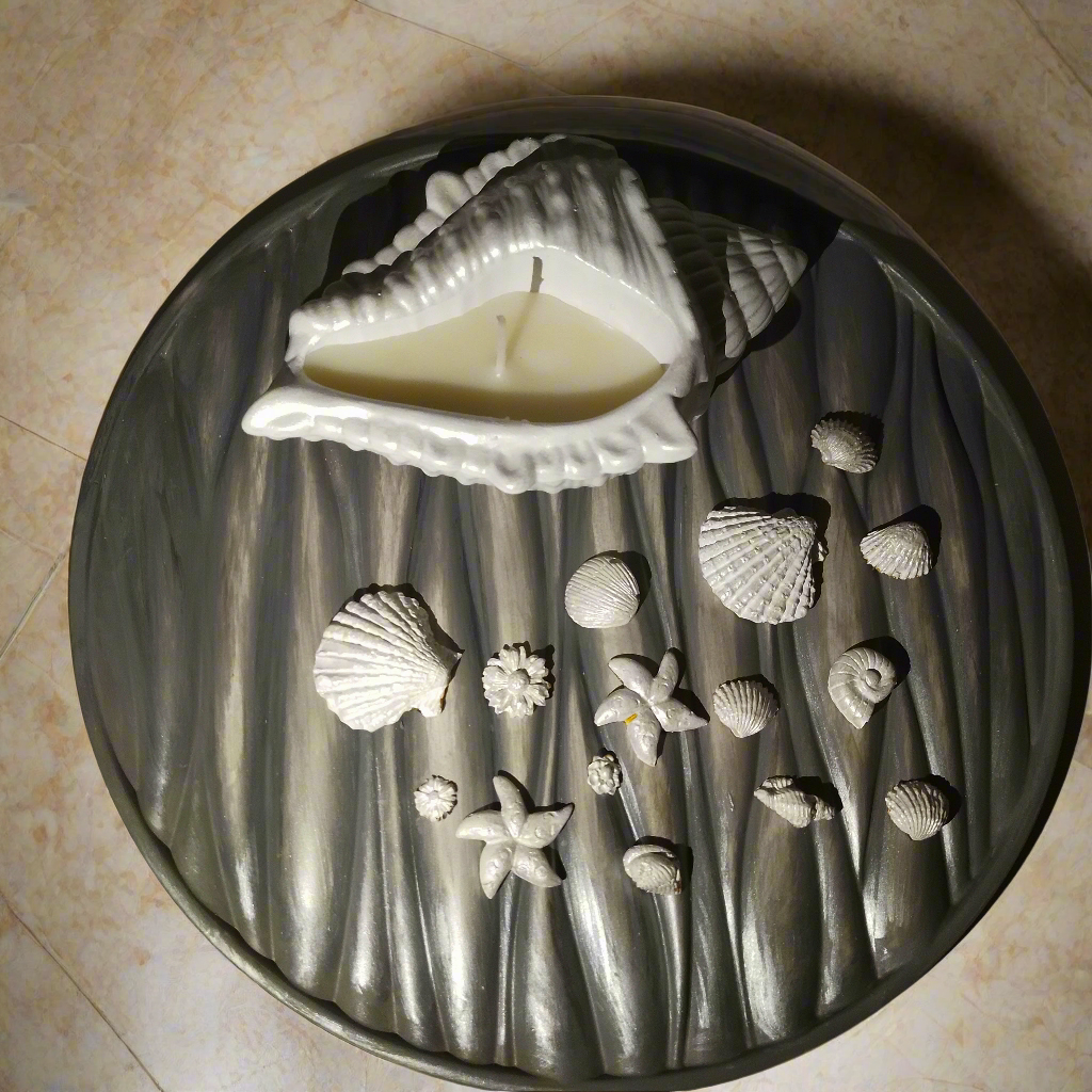 1 conjunto: Prato ondulado (30cm) (artefato em concreto) + Concha grande (gesso) com vela atóxica aromatizada com essências de frutas adocicadas e pequenos achados na areia da praia (gesso). Combina com todo estilo e ficará muito bonito na varanda, na sala, ou no cantinho de meditação. A tonalidade branco prateado evoca serenidade e maturidade. Após a queima da vela você poderá colocar cascas perfumadas.