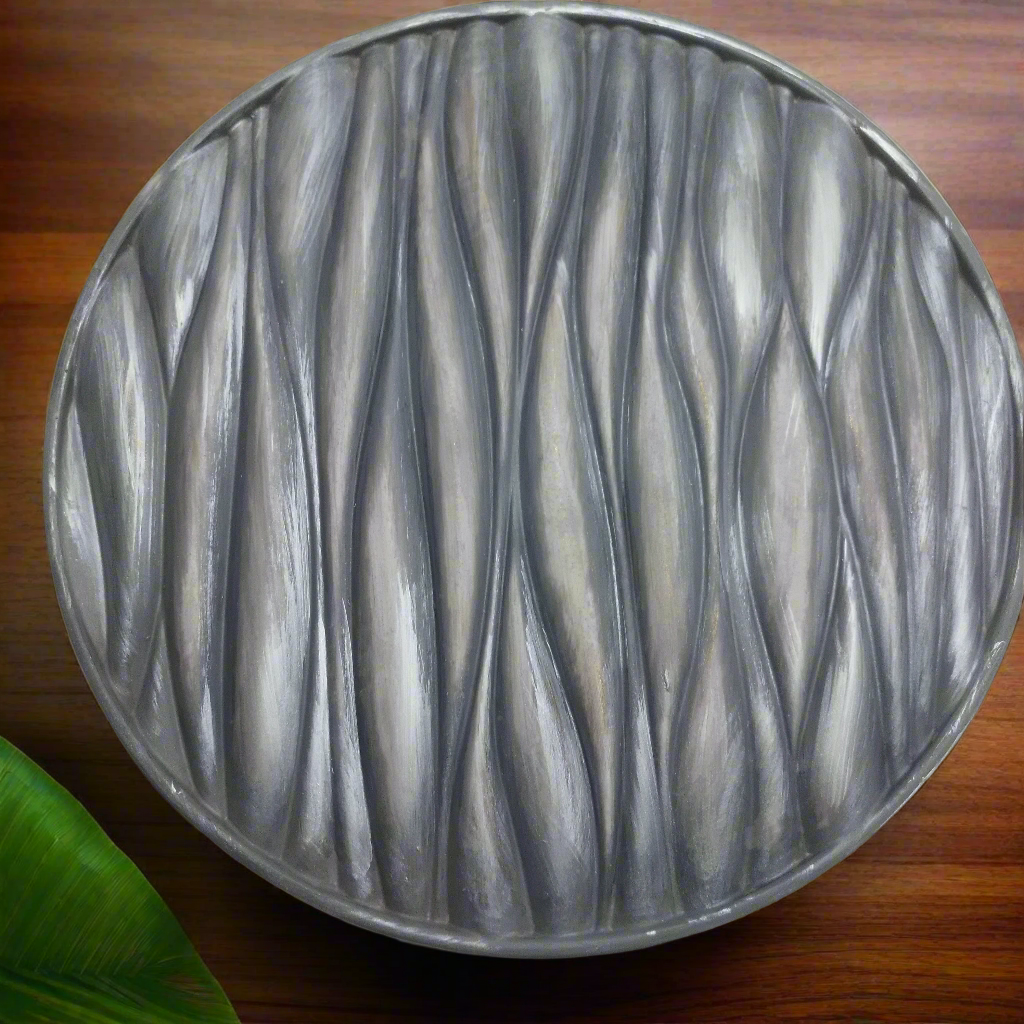 A bandeja tem uma textura em relevo que lembra ondas ou veios de madeira, com acabamento em tons de cinza e prata, dando um visual metálico e rústico.