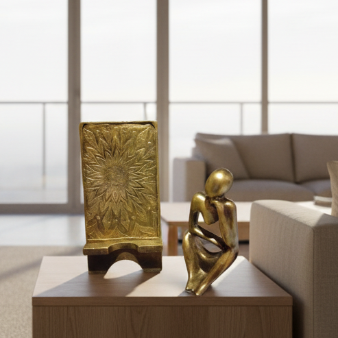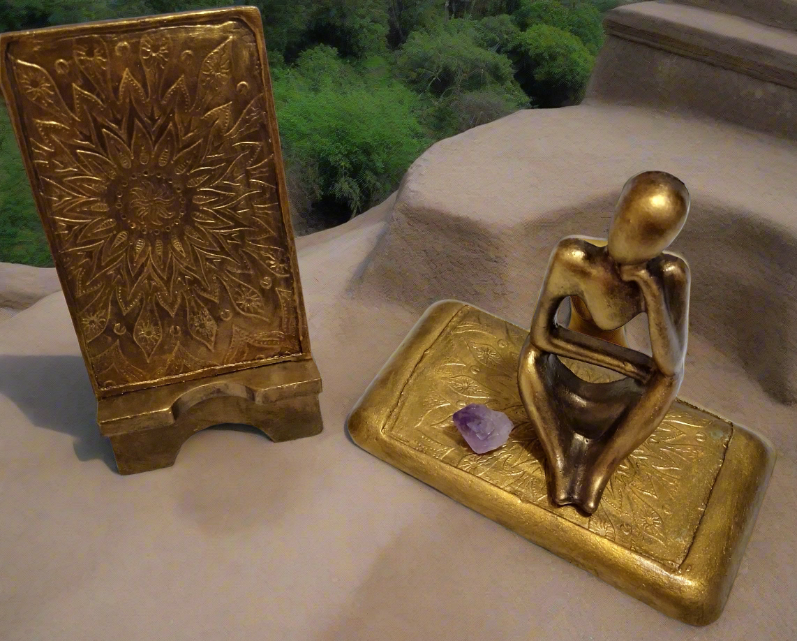 Transforme seu espaço com este conjunto artístico que irradia tranquilidade e sofisticação. Cada peça, feita de cimento de alta qualidade, foi pintada à mão em um tom dourado brilhante, trazendo um brilho especial ao seu lar ou escritório.