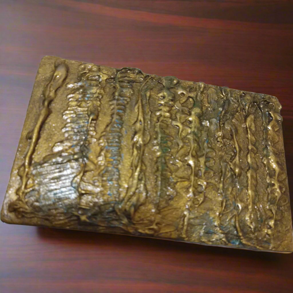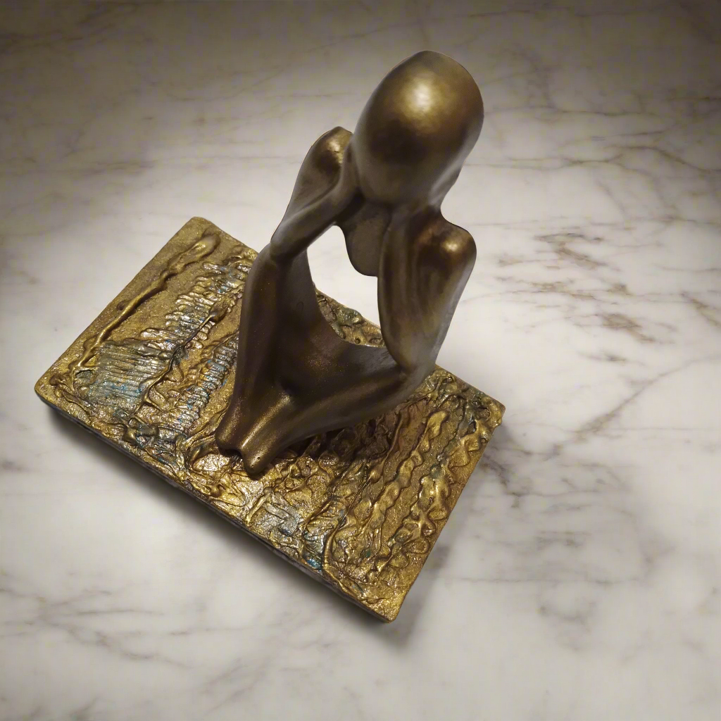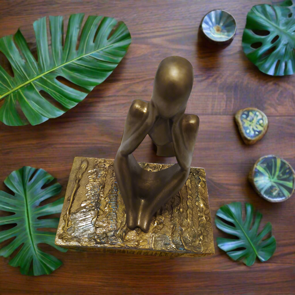 Esta peça de arte artesanal, intitulada "Pensador", é uma escultura única que combina a solidez do cimento com a delicadeza da tinta acrílica dourada. Com sua textura rica e acabamento metálico, ela adiciona um toque de introspecção e elegância a qualquer espaço.