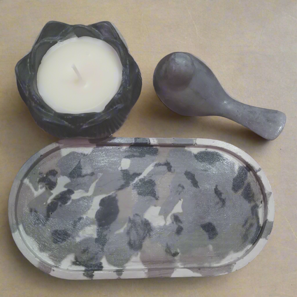 1 conjunto: Flor + Vela gel atóxica com essência adocicada, pássaro, bandeja (18,9cmX10,5cm). Material: Cimento, aditivos, pigmentos.