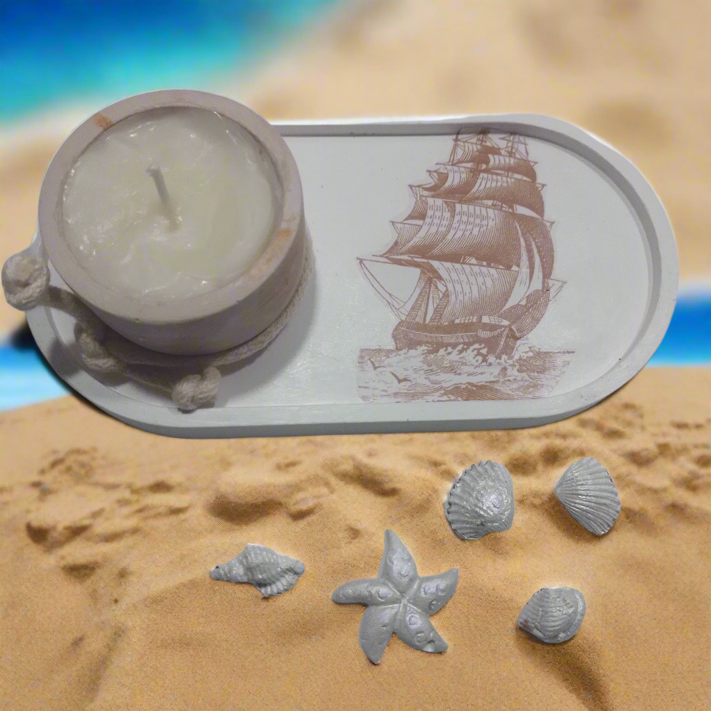 1 conjunto: pote (vela gel atóxica aromatizada com essências)+ bandeja. Material: cimento,aditivos, pigmentos. Vela: essências de mel e frutas. Pequenos objetos na cor: branco e dourado.