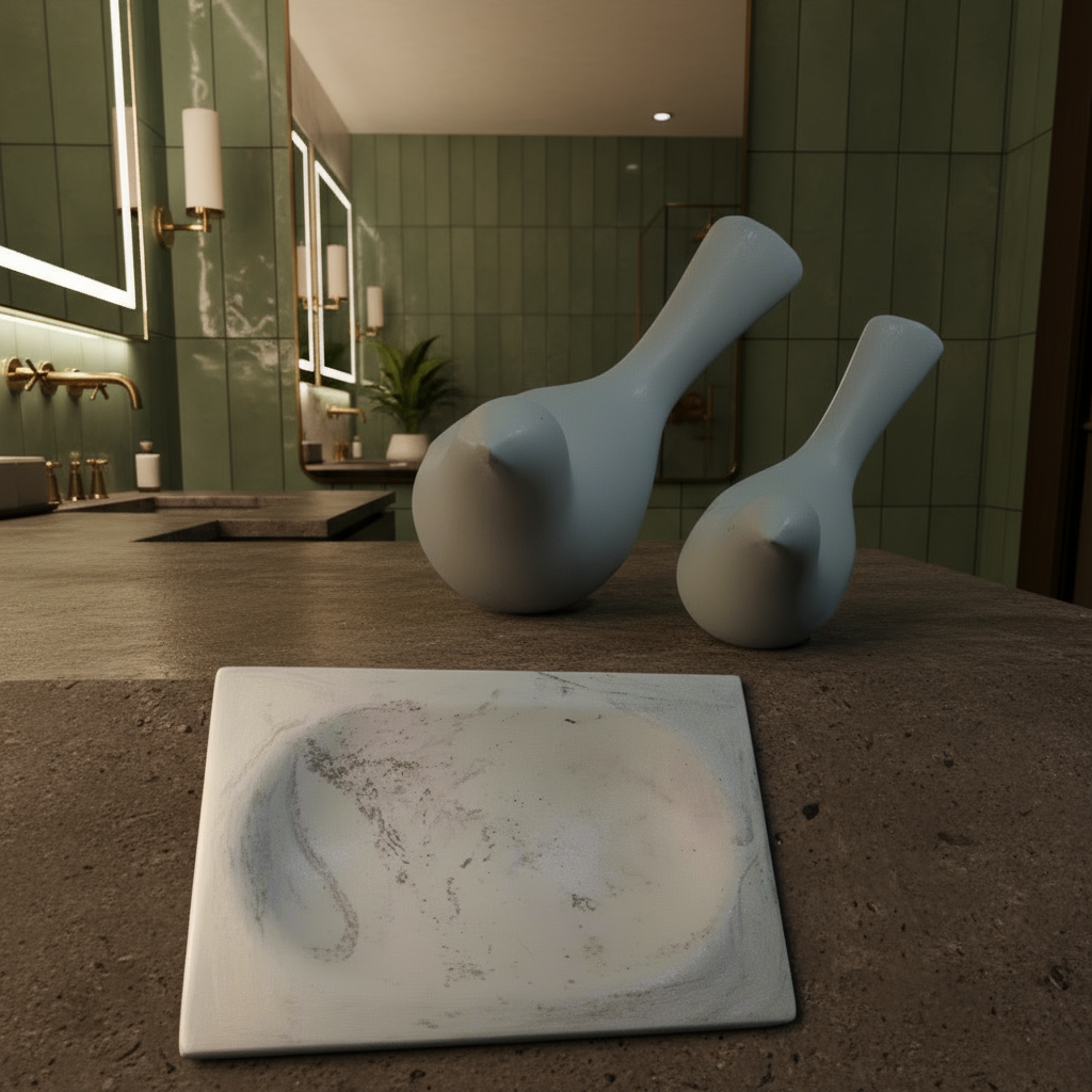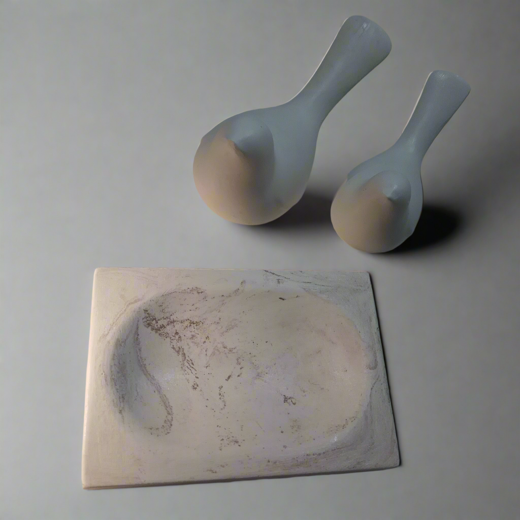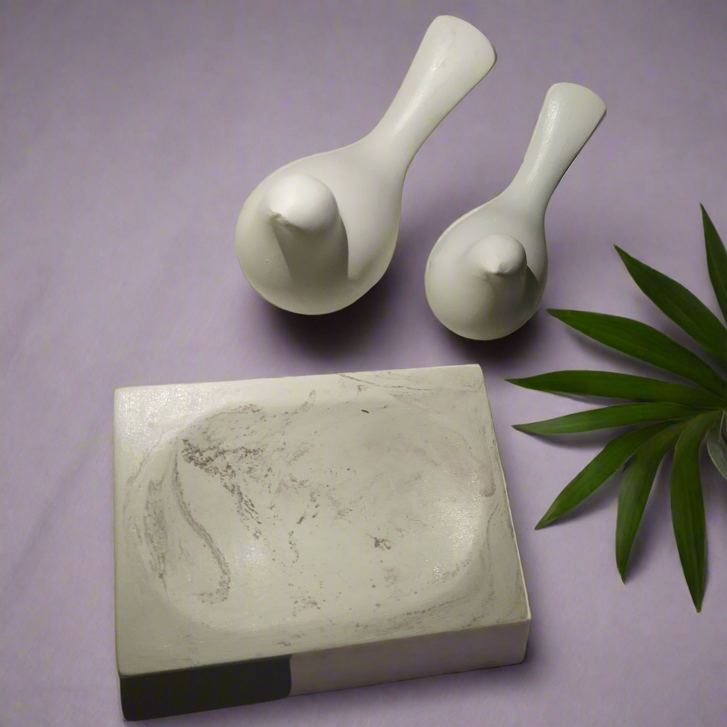 1 saboneteira (12cm X 8cm), 1 pássaro (8cm X 3cm), 1 pássaro (10cm X 5cm). Material: cimento, aditivos, pigmentos.