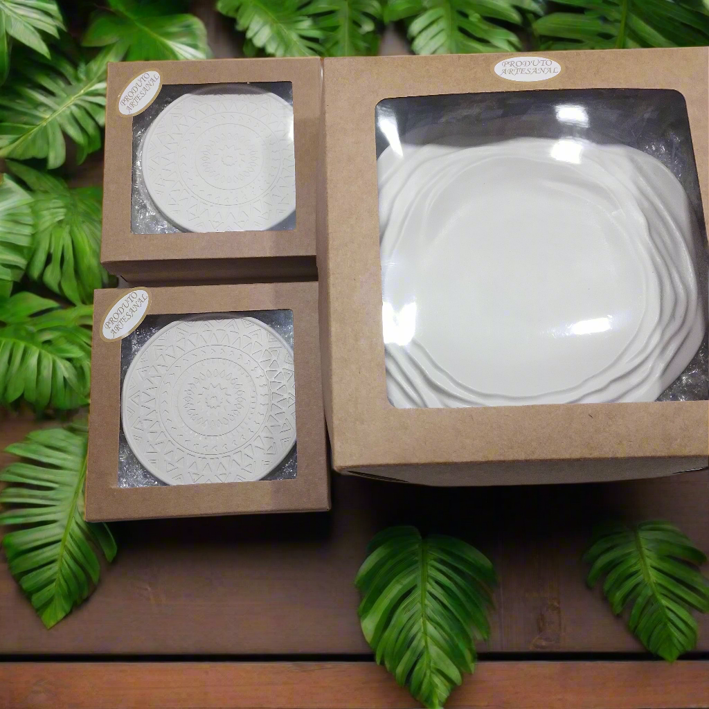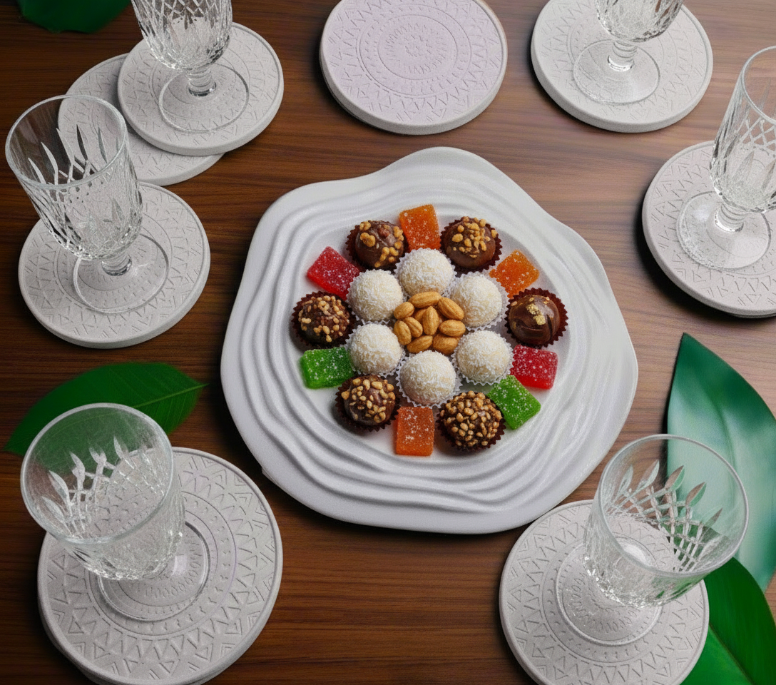 Beleza e funcionalidade se encontram neste conjunto de 1 prato de docinhos e 6 porta-copos. Feito em cimento com pigmento, ele traz a durabilidade do material e as reflexões neutras para sua mesa, garantindo um visual moderno. Cada peça foi produzida de maneira artesanal para conferir originalidade ao conjunto.