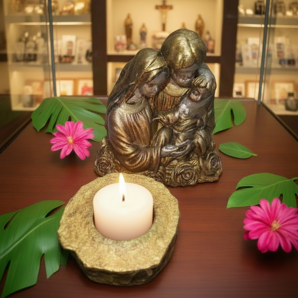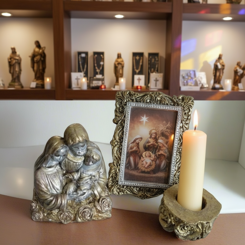 Cantinho Devocional Sagrada família + castiçal +porta retrato referência n°004