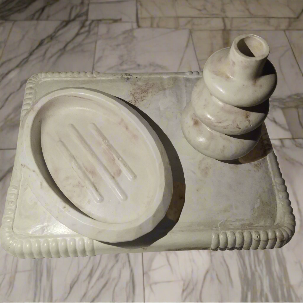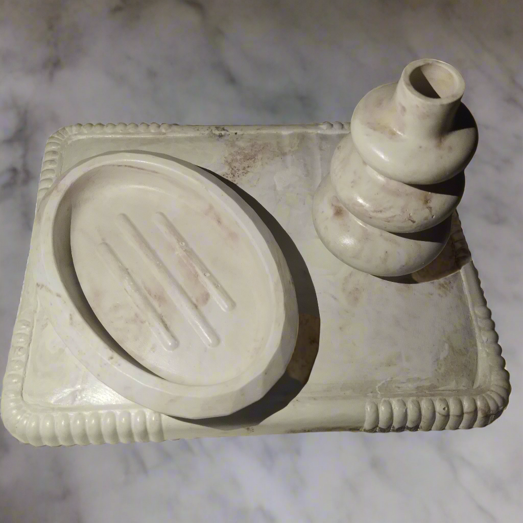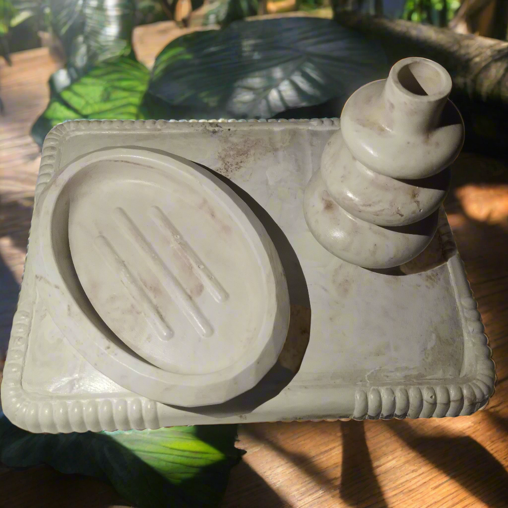 O conjunto completo, composto por bandeja, saboneteira e recipiente para difusor de aromas, foi pensado para criar uma experiência sensorial completa, unindo design e fragrância para decorar e perfumar o ambiente.