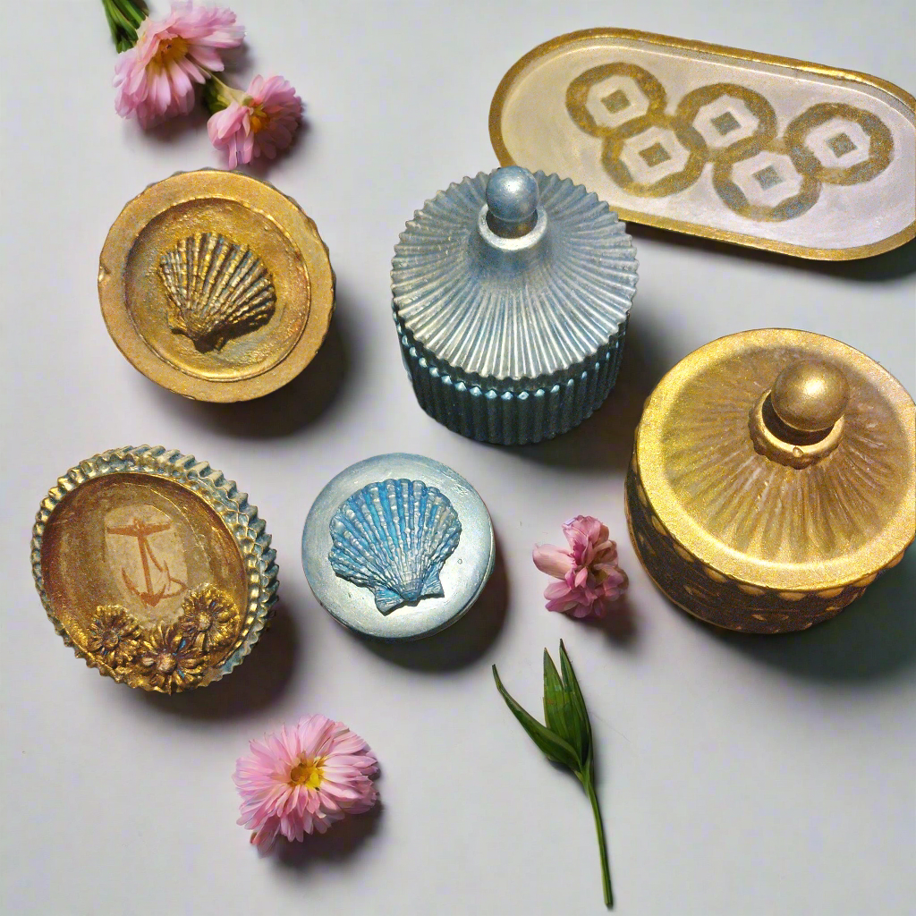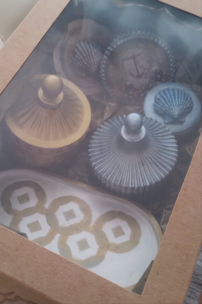 Conjunto de seis peças decorativas de artesanato em gesso pintado. O preço é referente aos 2 potes + a bandeja. Os demais objetos são cortesia.
