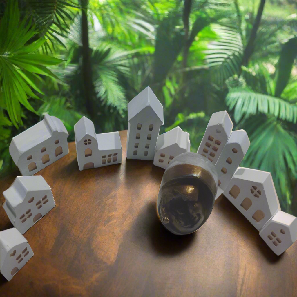 - As Casas em Miniatura (A Comunidade de Fé): As pequenas casas brancas representam a "Cidade de Deus" ou a "Nova Jerusalém" – um lugar de paz, refúgio e união fraterna. Elas simbolizam a Igreja como a congregação dos fiéis, o lugar onde a fé é vivida em comunidade e onde cada indivíduo é essencial para a estrutura do corpo de Cristo.
