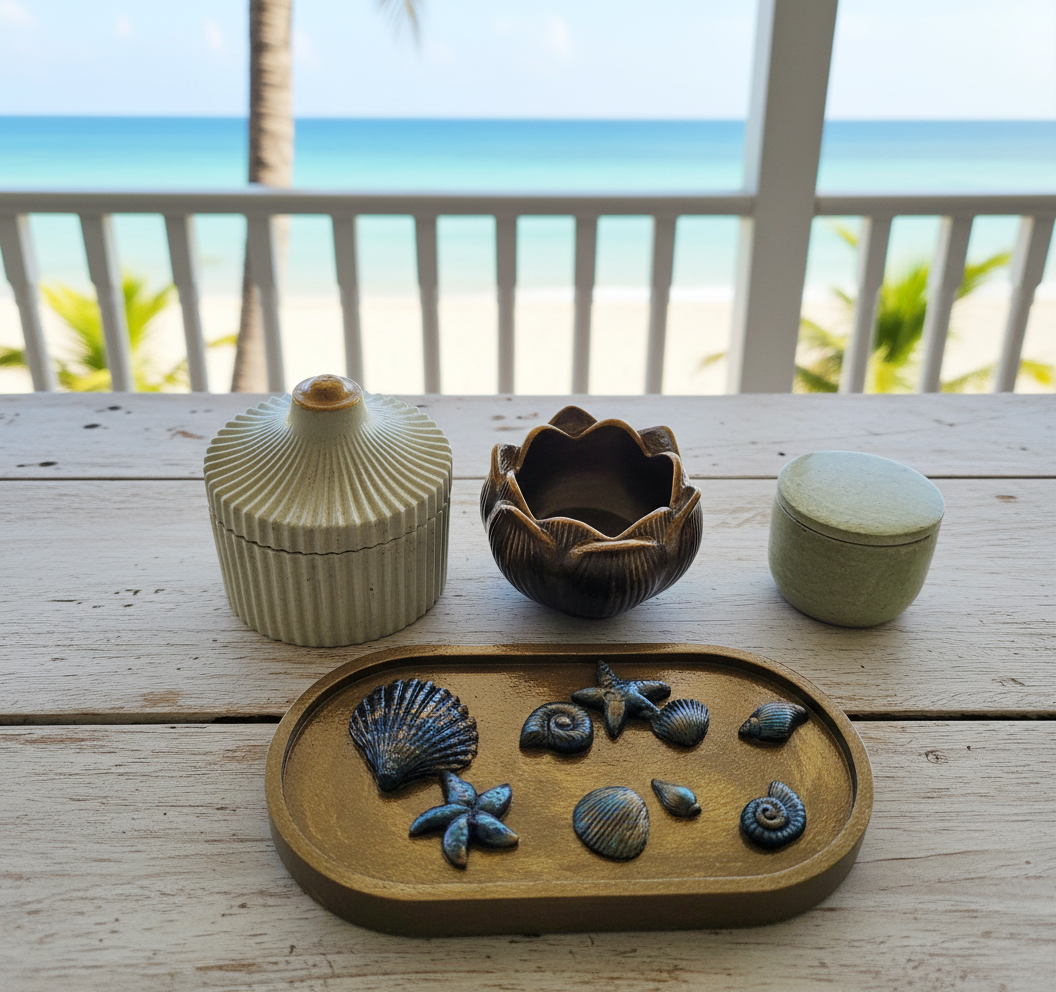Estes artefatos artesanais enfeitam áreas externas como varandas e jardins. A bandeja poderá ser utilizada até para servir o delicioso cafezinho. Os potes são ótimos para balas, castanhas ou pequenos bombons. A Flor de Lótus poderá ser utilizada para guardar cascas aromatizadas e deixar o ambiente sempre perfumado. As miudezas servem para enfeitar ou fazer pequenas apostas: coloque-as nas mãos e mantenha-as fechadas solicite aos demais participantes que adivinhem a quantidade ou o tipo, desta maneira o clima de férias estará sempre no ar.