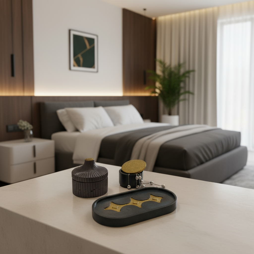 Conjunto de 3 peças: 1 bandeja pequena: 18,9cmX10,5cm, 1 pote: 8,2cm X4cm, 1 pote: 7cm X 3,6cm.