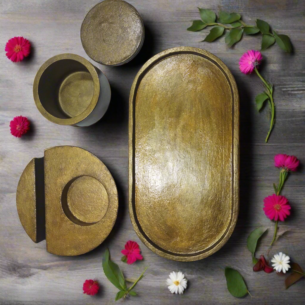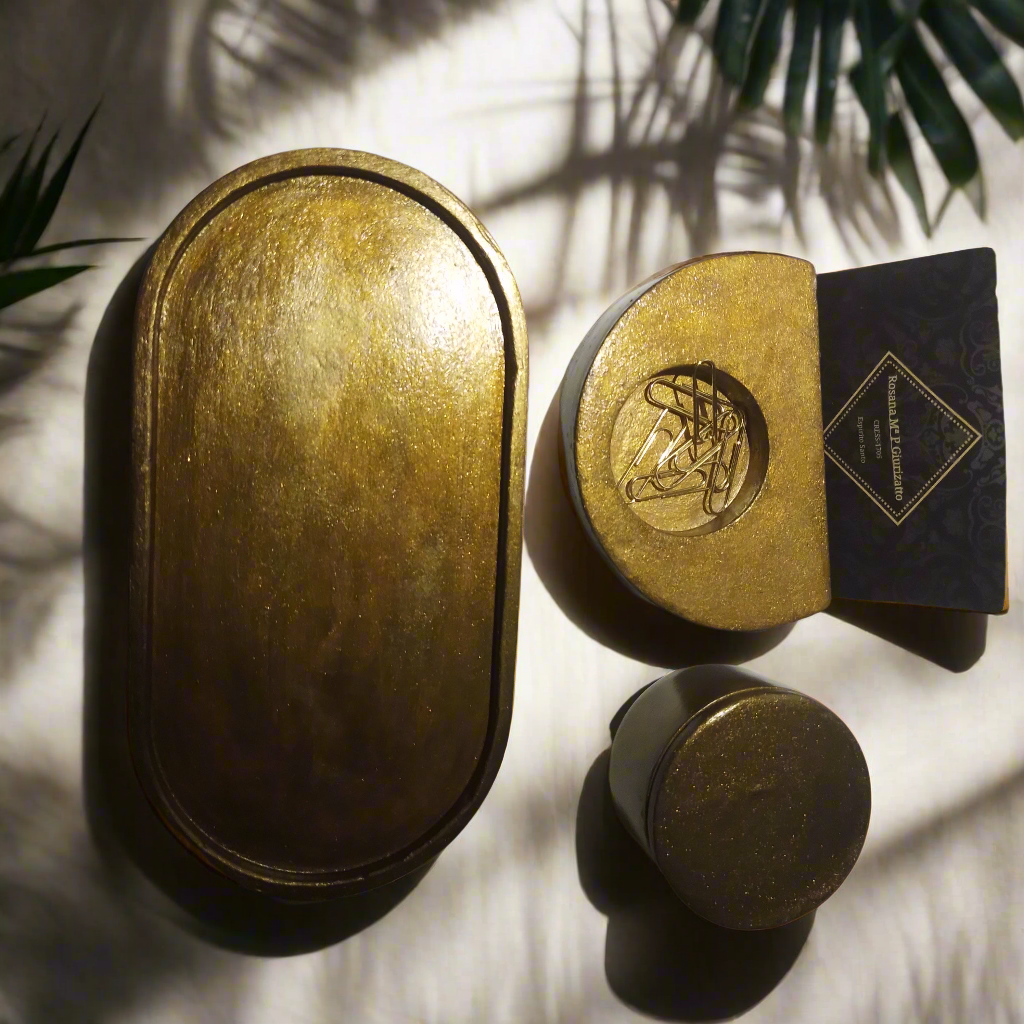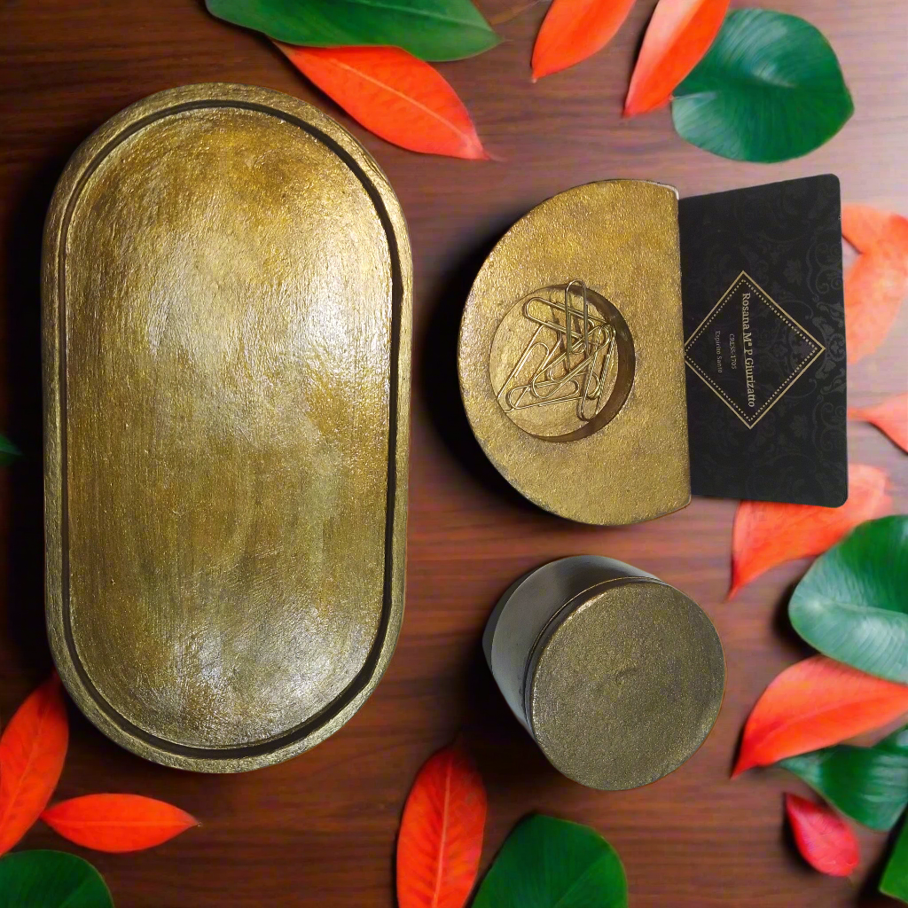 1 bandeja- Extensão: 18,9cm X 10,5cm , 1 pote: 6cm X 4cm, 1 artefato redondo multiuso: L10cm.