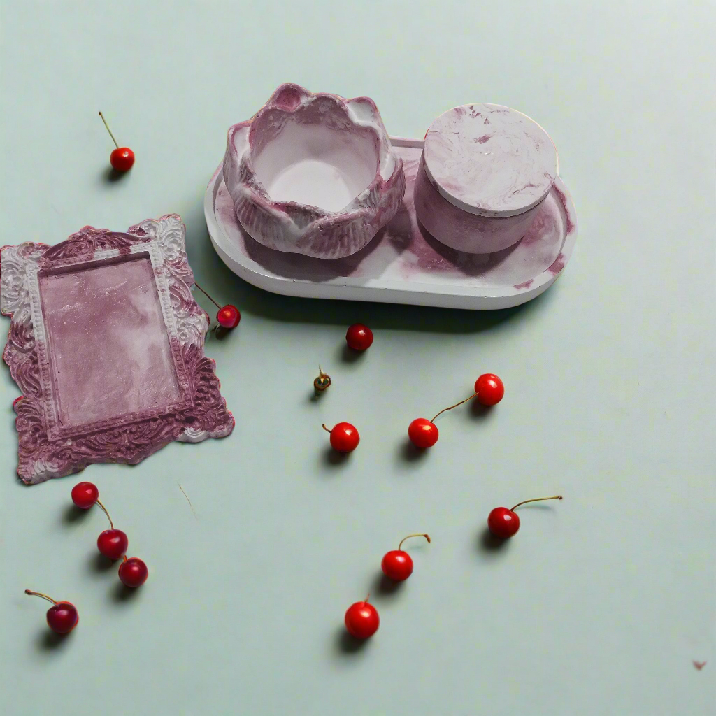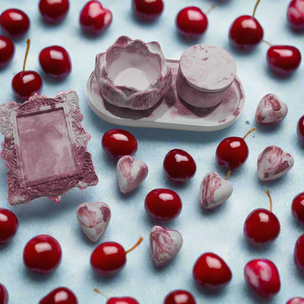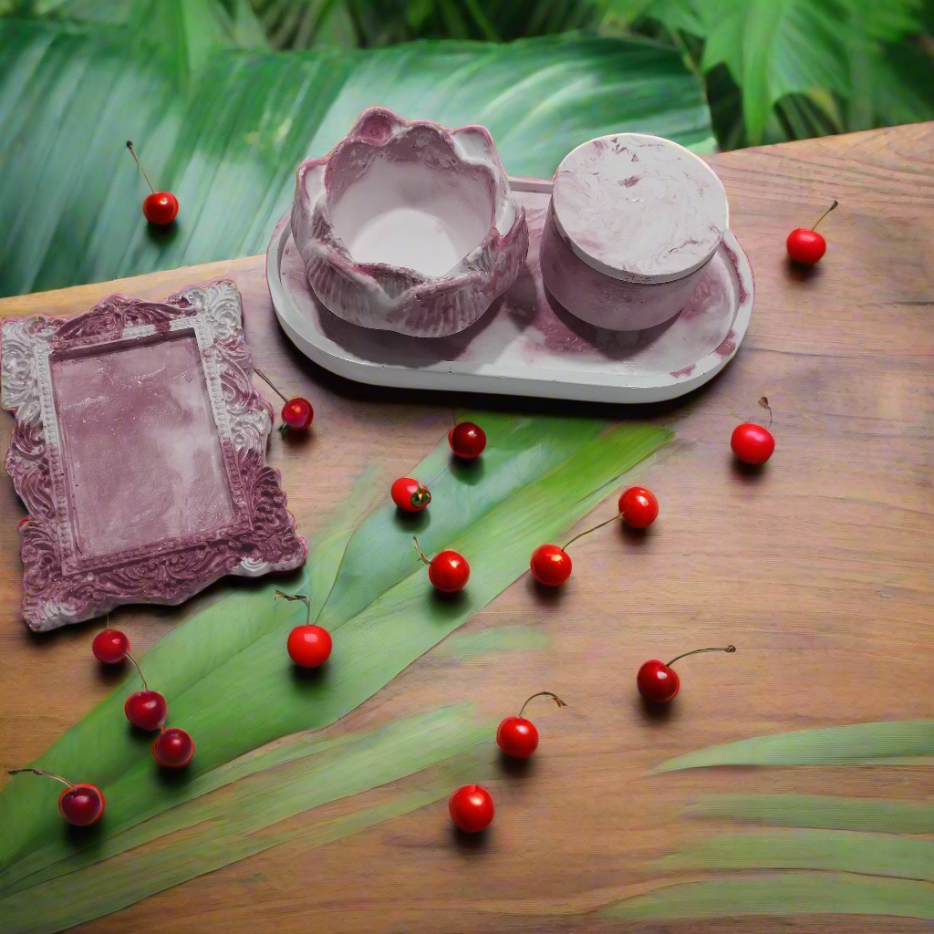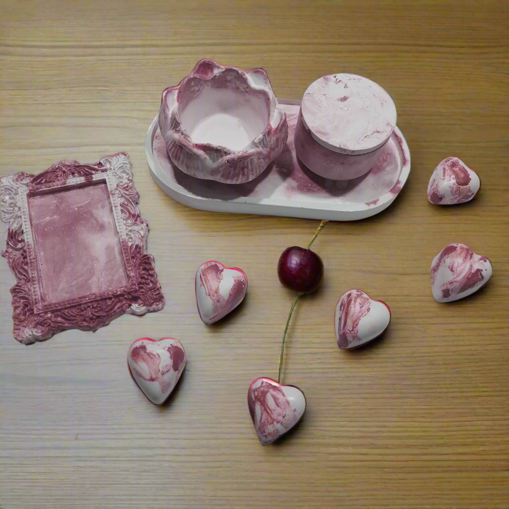 Estes objetos de concreto, produzidos à mão, trazem o frescor e a renovação da Primavera para enfeitar a sala, quarto ou banheiro. O delicado efeito marmorizado em tons de branco e rosa evoca a beleza das flores com o adocicado da cereja, celebrando a estação da vida, da cor e do sabor.