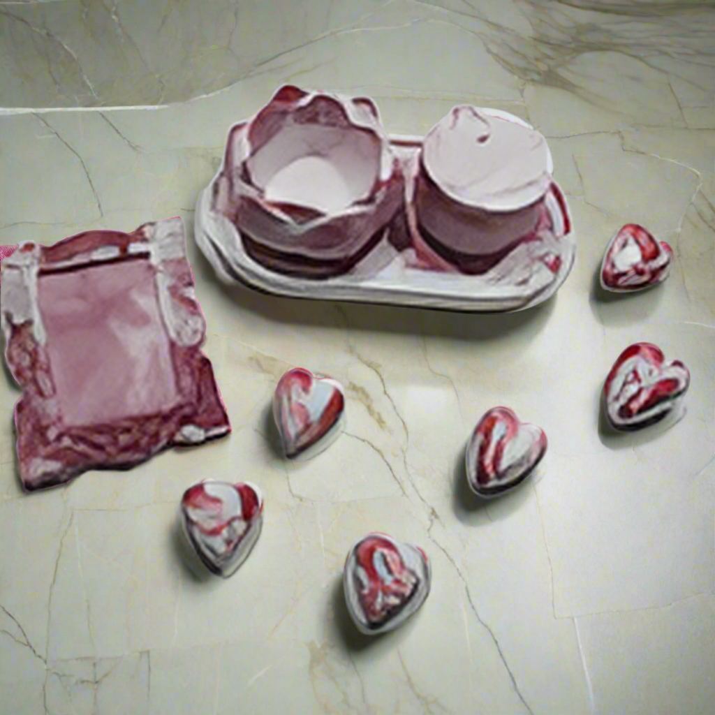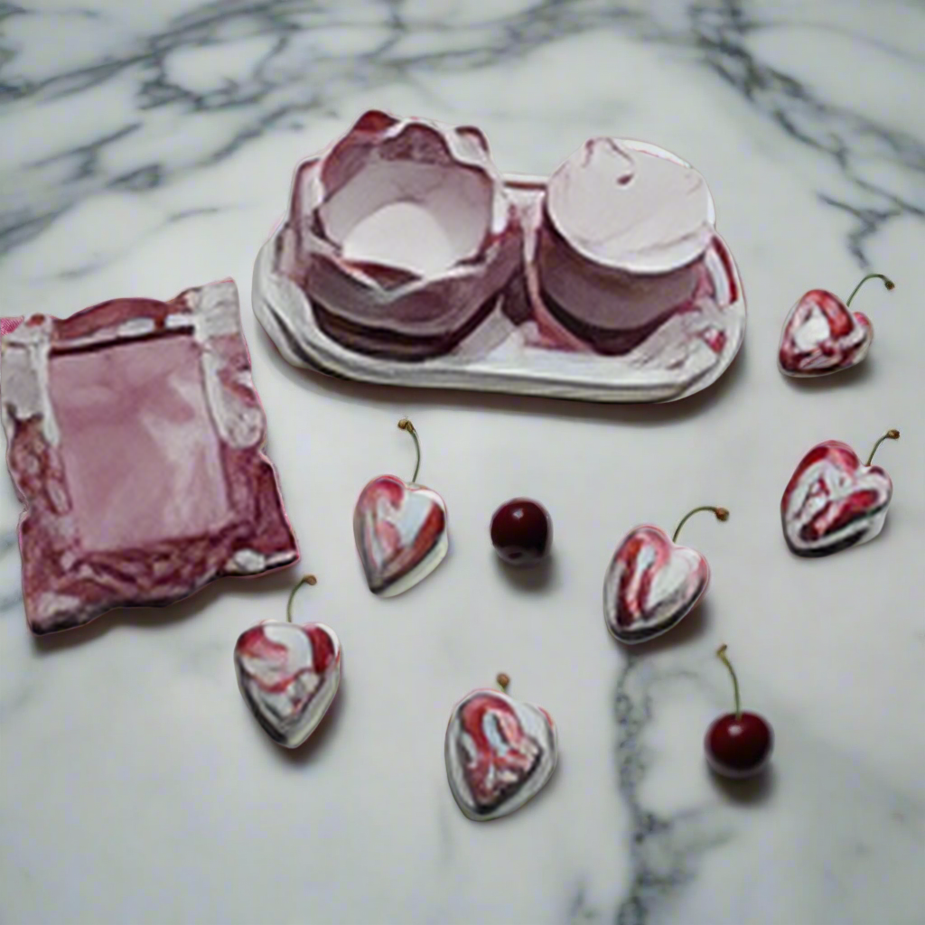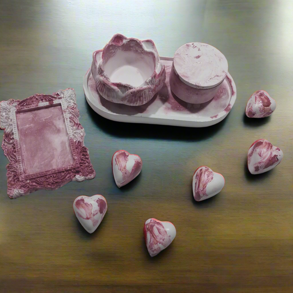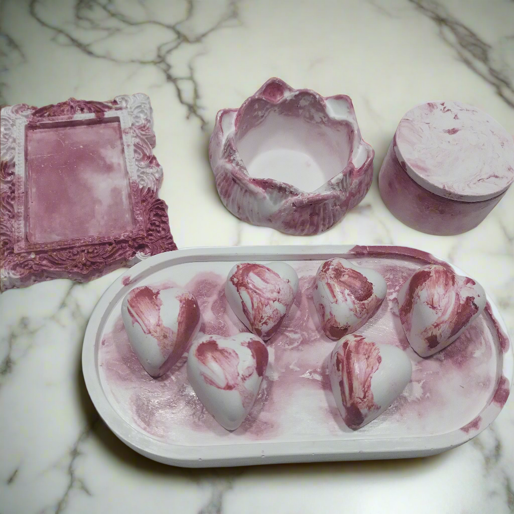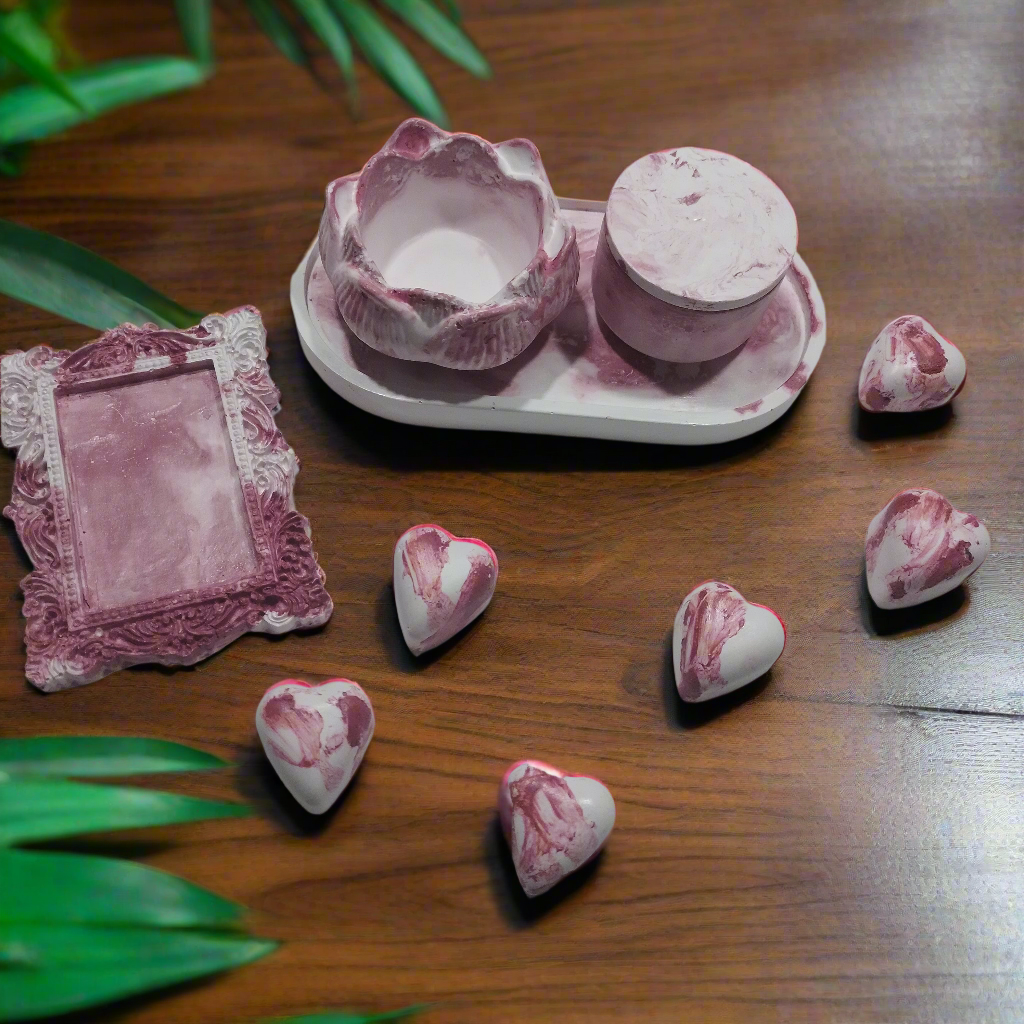 Estes objetos de concreto, produzidos à mão, trazem o frescor e a renovação da Primavera para enfeitar a sala, quarto ou banheiro. O delicado efeito marmorizado em tons de branco e rosa evoca a beleza das flores com o adocicado da cereja, celebrando a estação da vida, da cor e do sabor.