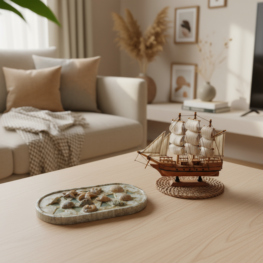 Uma peça única para a sua decoração! Esta bandeja artesanal de gesso tem um lindo efeito dourado feito com pintura acrílica brilhante, é decorada com conchas e estrelas-do-mar. Perfeita para dar um toque de arte à sua casa.
