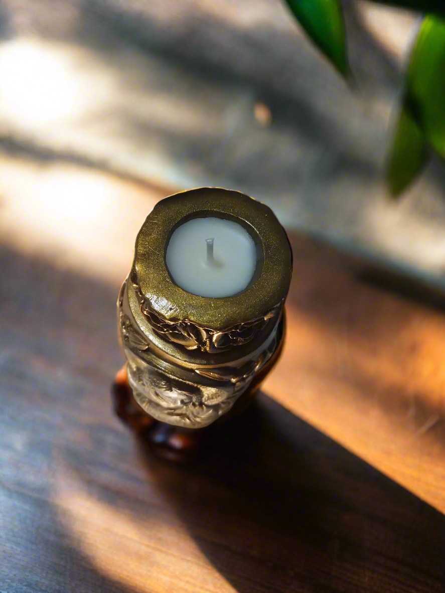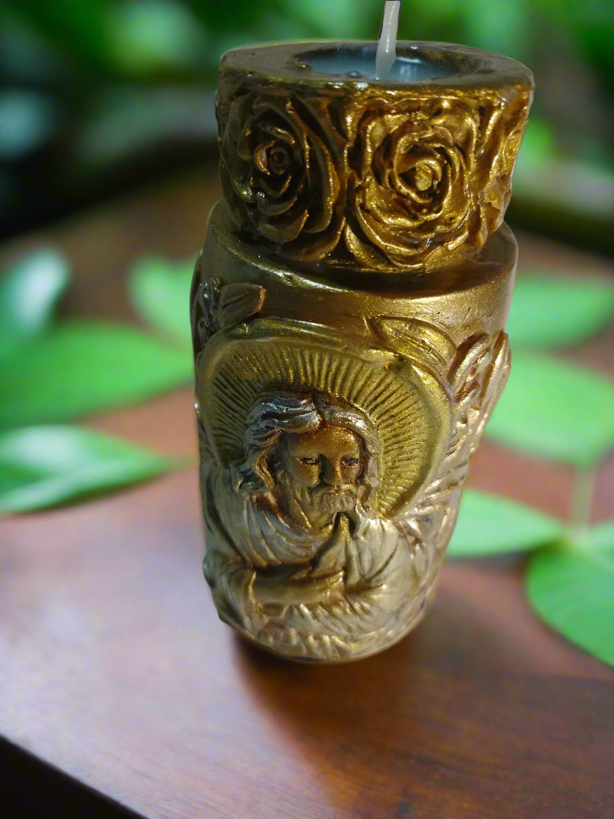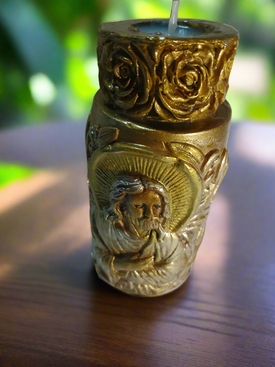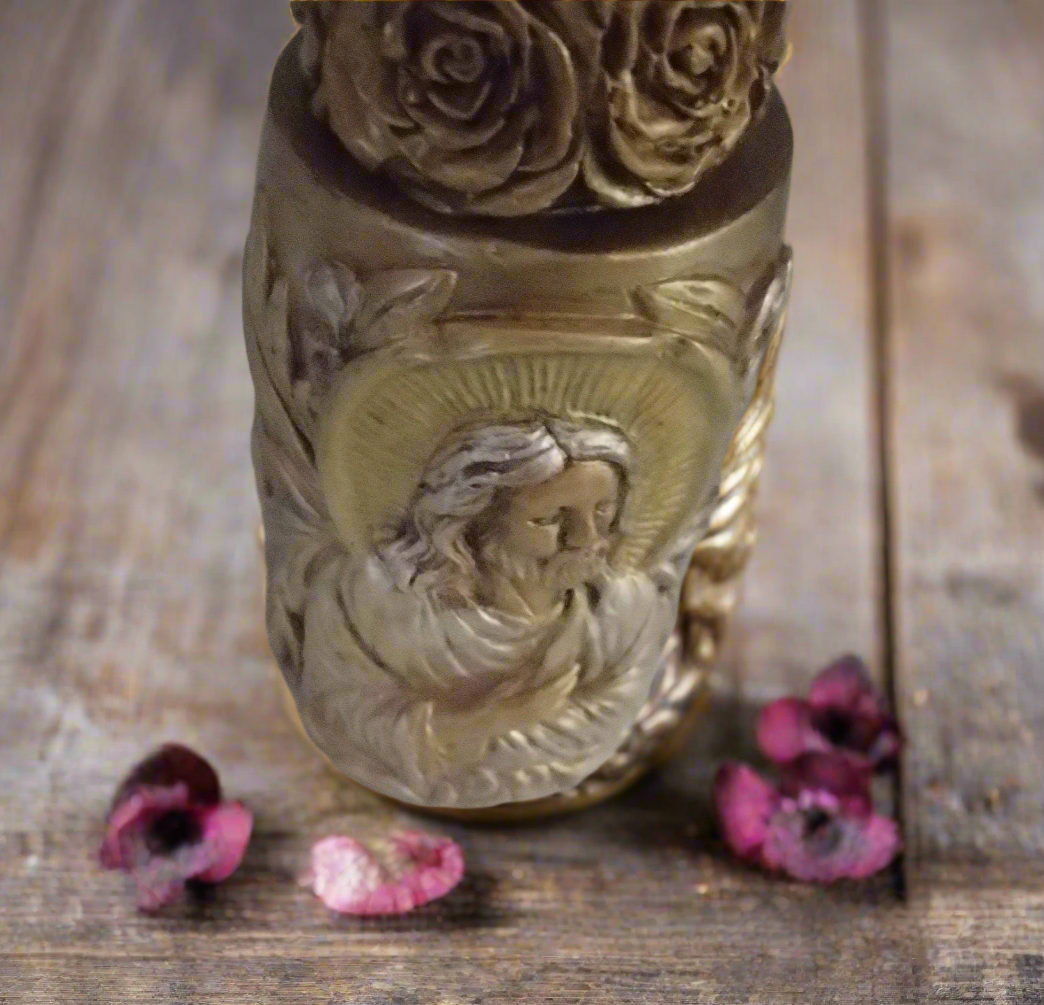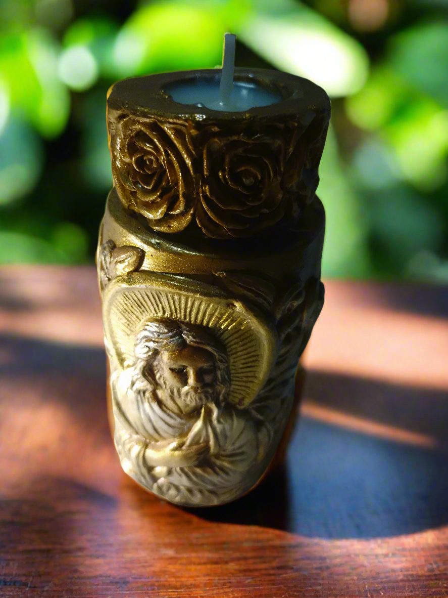 Uma peça feita em gesso e pintada com tinta acrílica brilhante, possui uma cavidade central na qual foi instalada a vela atóxica aromatizada, este é um elemento simbólico da devoção, não é necessário acender o pavio.