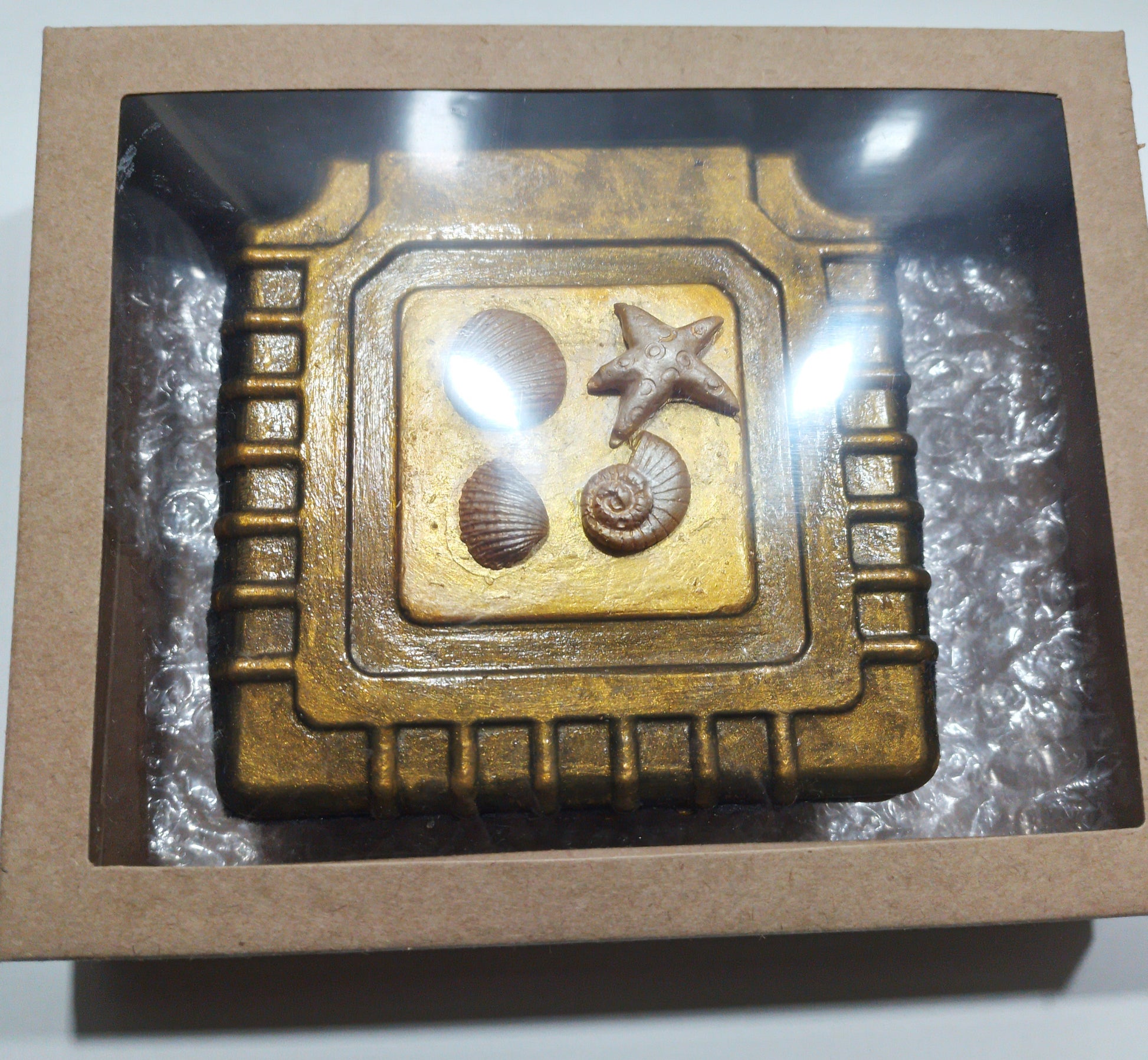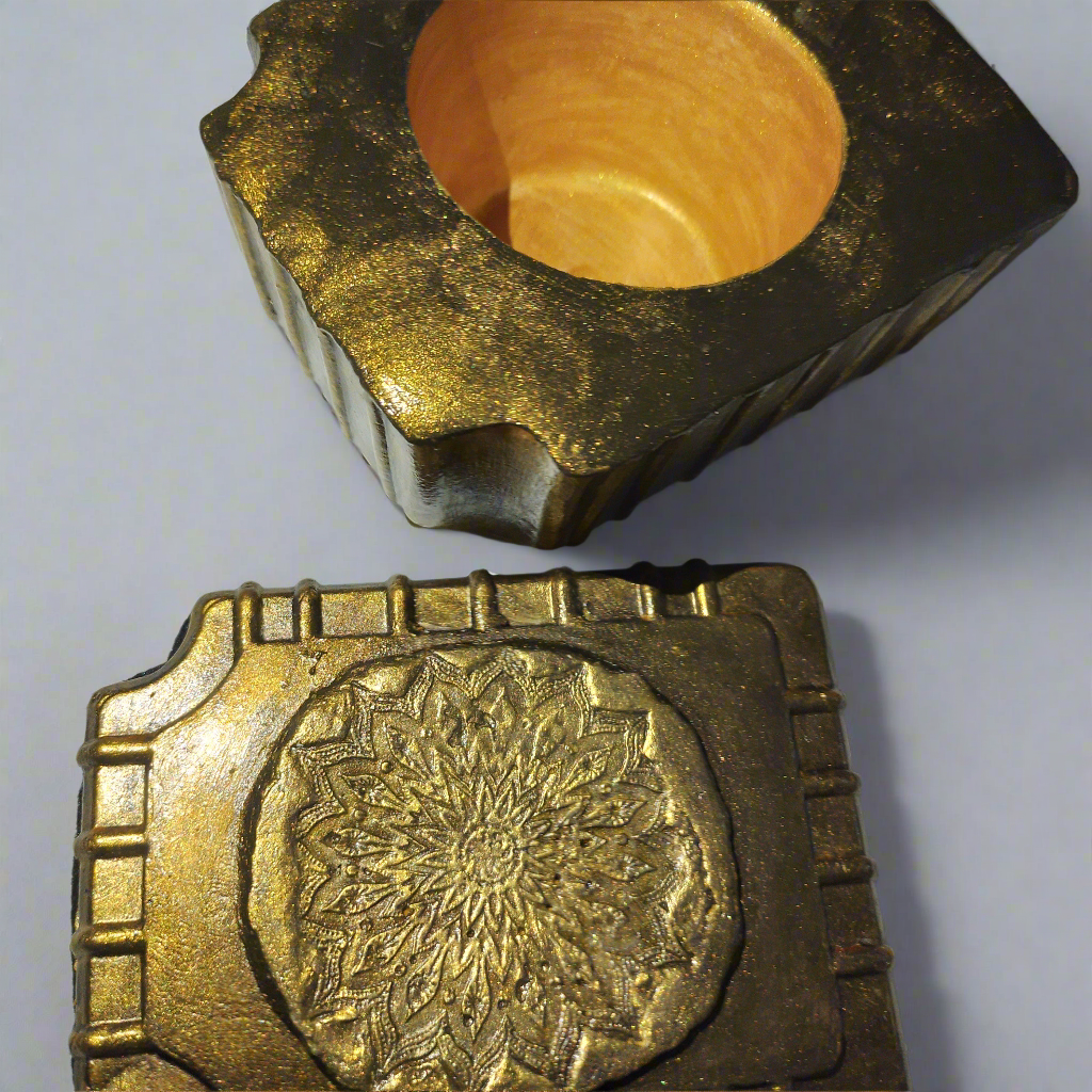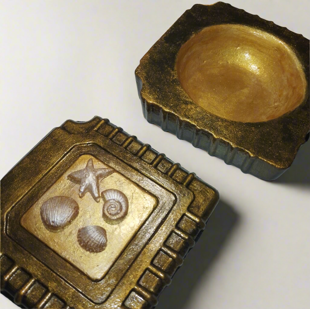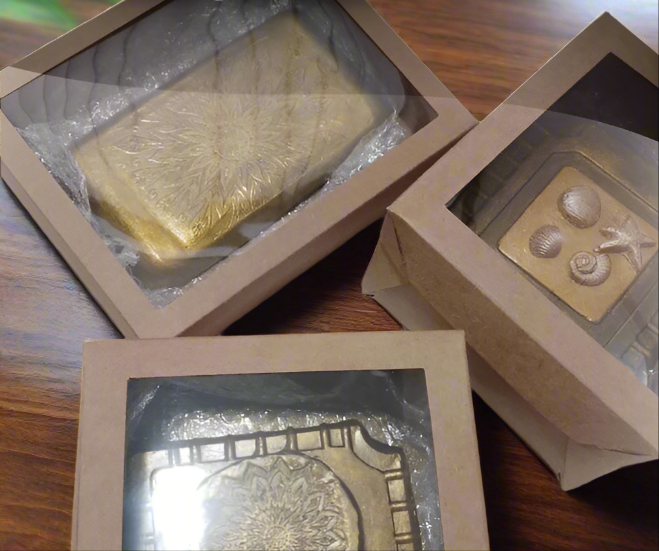 Artesanatos produzidos em cimento, com pintura metalizada e verniz.