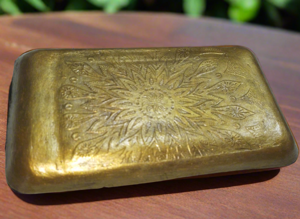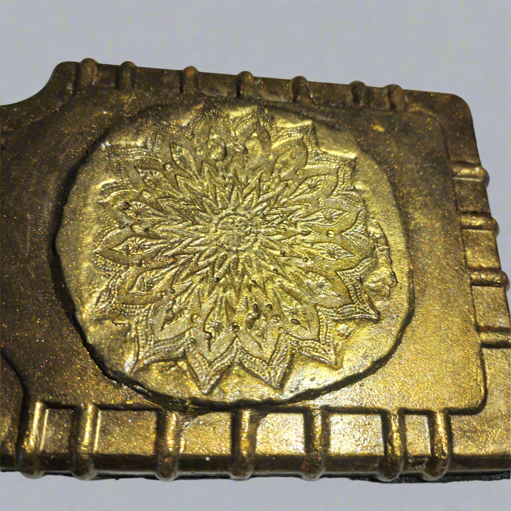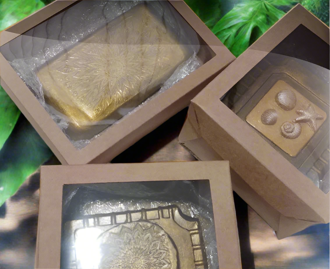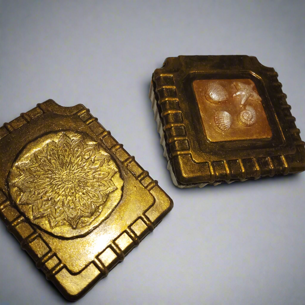 Artesanatos produzidos em cimento, com pintura metalizada e verniz.