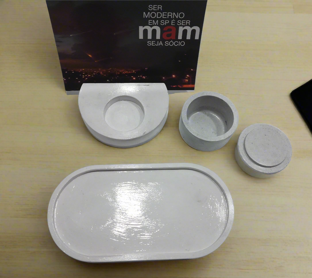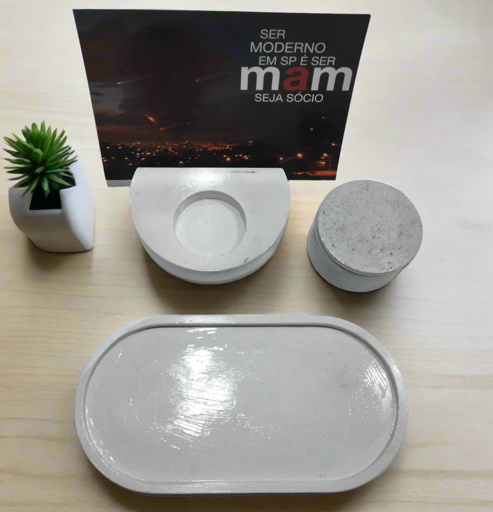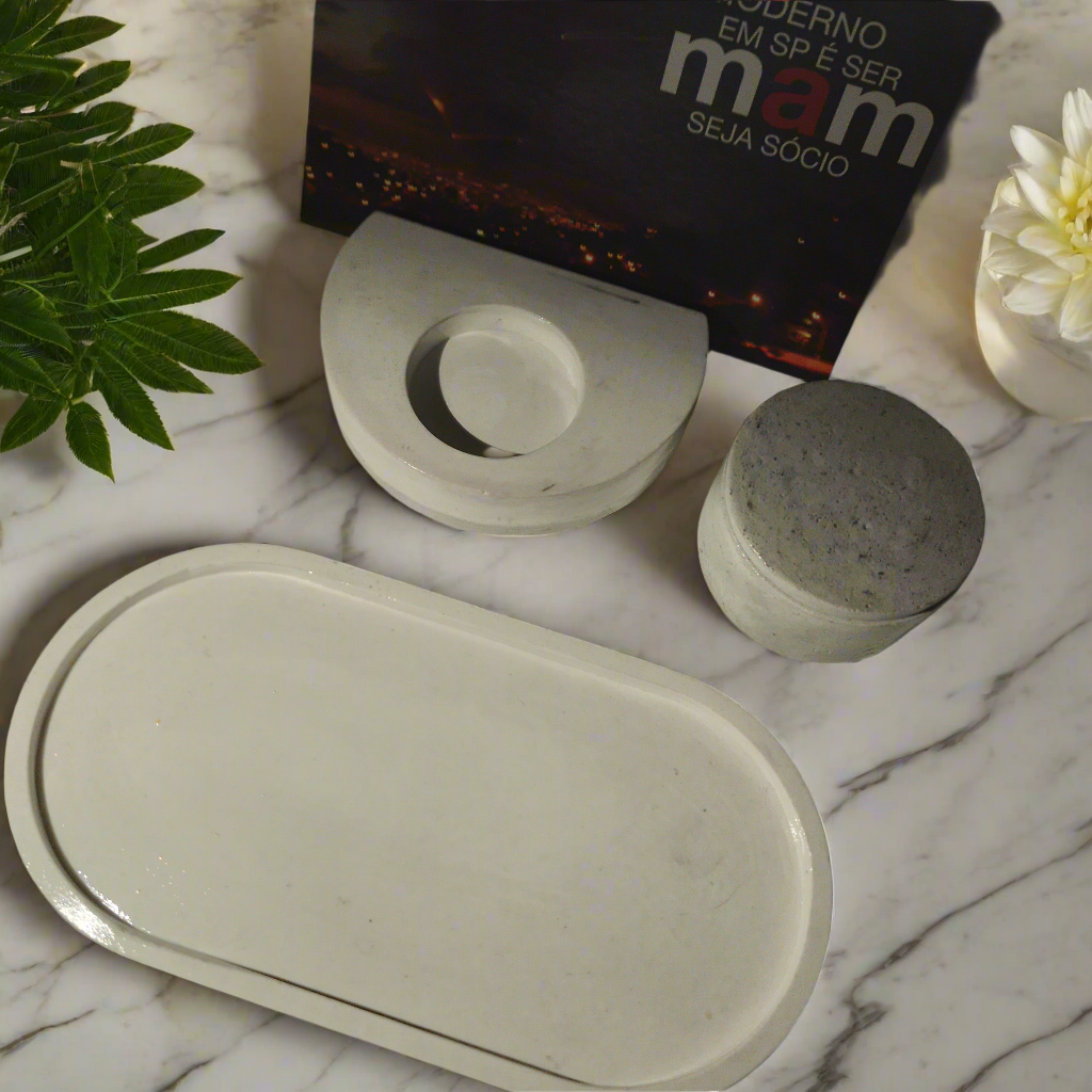 Esta produção em gesso artesanal possui moldagem e acabamento que concedem maior resistência aos objetos. Além disso toda a massa é esterilizada através do álcool 70 Graus. A finalização em verniz resultou no brilho suave realçando a característica rústica. A bandeja também serve para acomodar 1 copo ao lado do pote com tampa, o qual serve para comprimidos ou outros objetos pequenos. Outra sugestão de uso: o pote com cartão-postal serve para lembrar instruções importantes sobre comprimidos. Estes objetos ficam bem na cabeceira da cama ou noutros lugares da casa ou do escritório, no qual adquirem as seguintes utilidades: porta-cartões, porta-grampos, porta-grampeador. Deixando tudo organizado e no lugar certo.