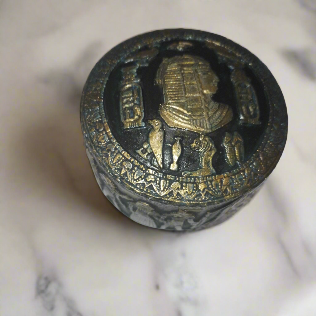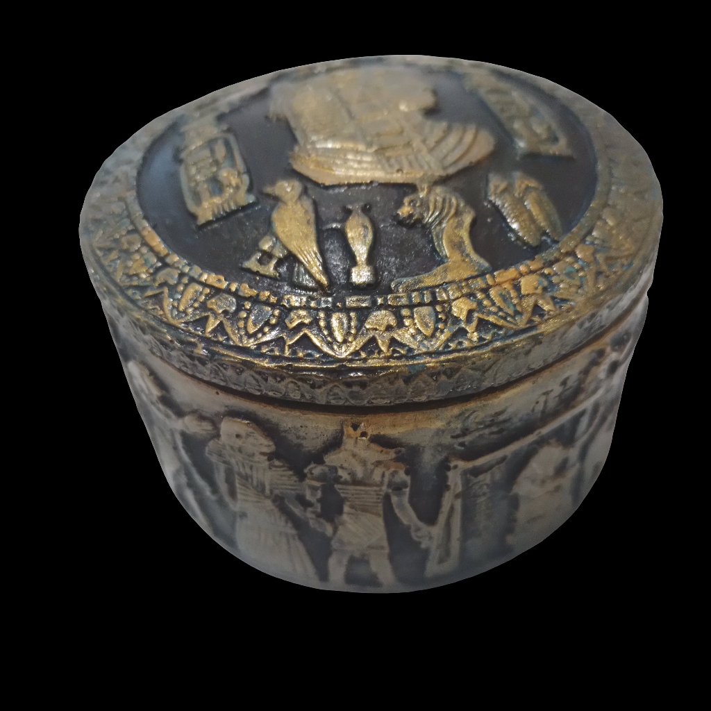 Este belíssimo pote decorativo é uma peça inspirada na rica e misteriosa cultura do Antigo Egito. Com detalhes em relevo e um acabamento que imita bronze e pátina envelhecida, ele é perfeito para quem busca um toque de elegância.