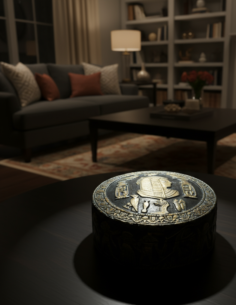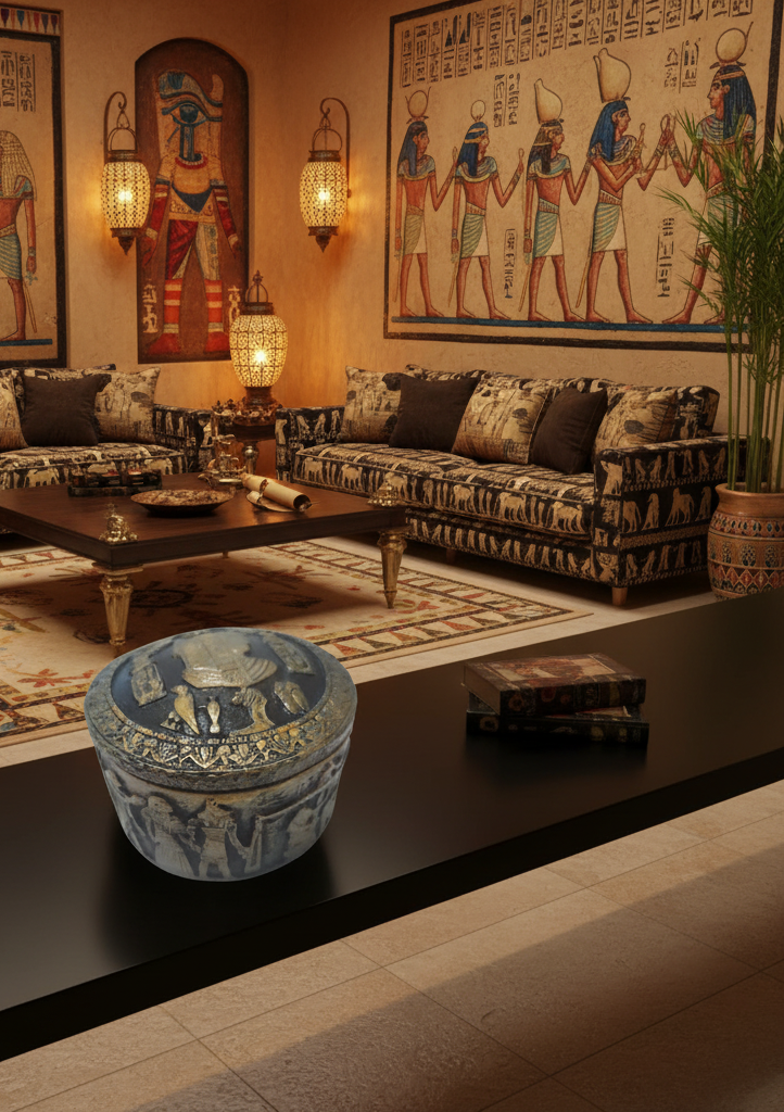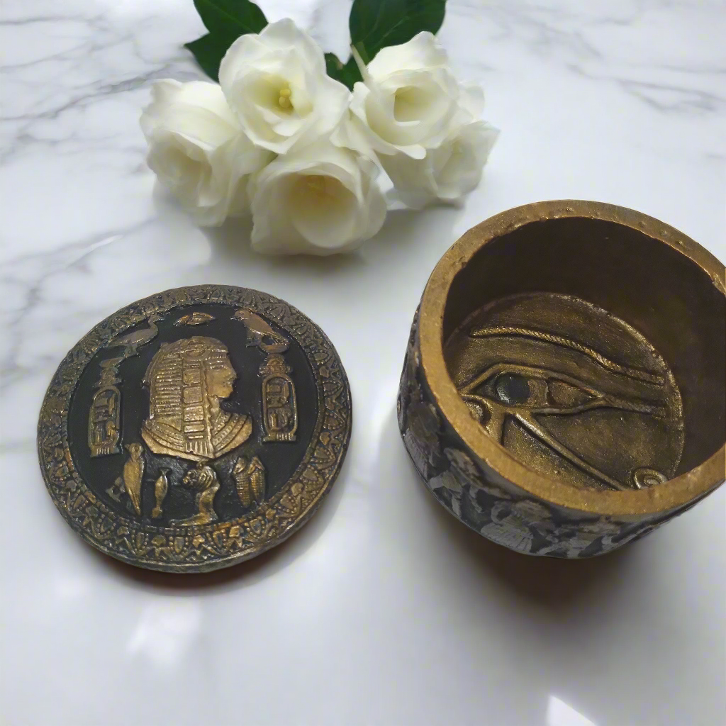 * Símbolos Místicos: Ao abrir o pote, você encontra o Olho de Hórus esculpido no fundo, um dos mais poderosos símbolos de proteção e poder da mitologia egípcia.