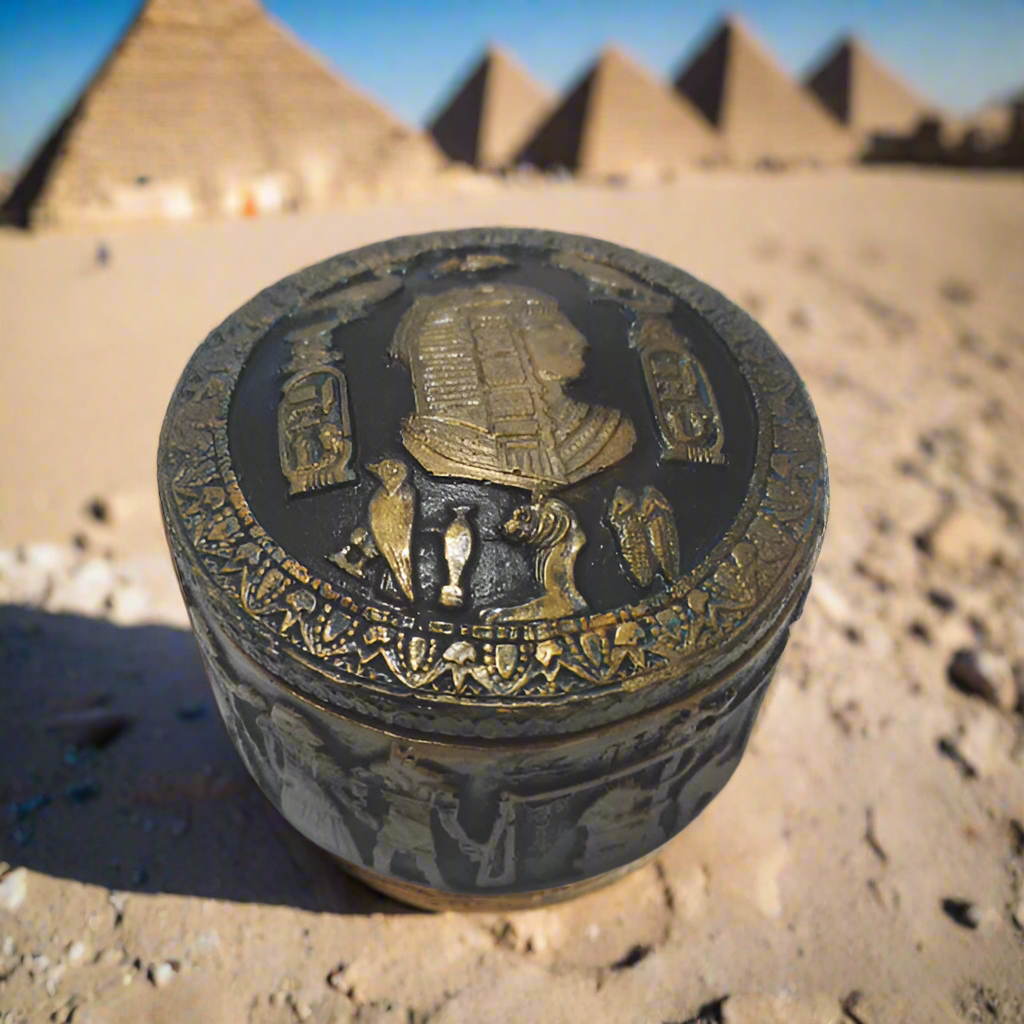 * Design Autêntico: A tampa apresenta um detalhe em relevo de Faraó com seus trajes tradicionais e símbolos hieroglíficos. As laterais do pote são decoradas com figuras egípcias, como o perfil de um faraó e a imagem da Rainha Nefertiti.