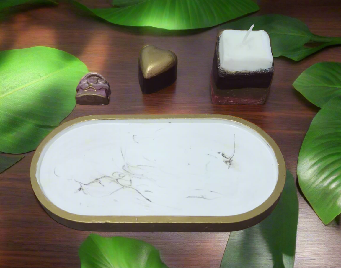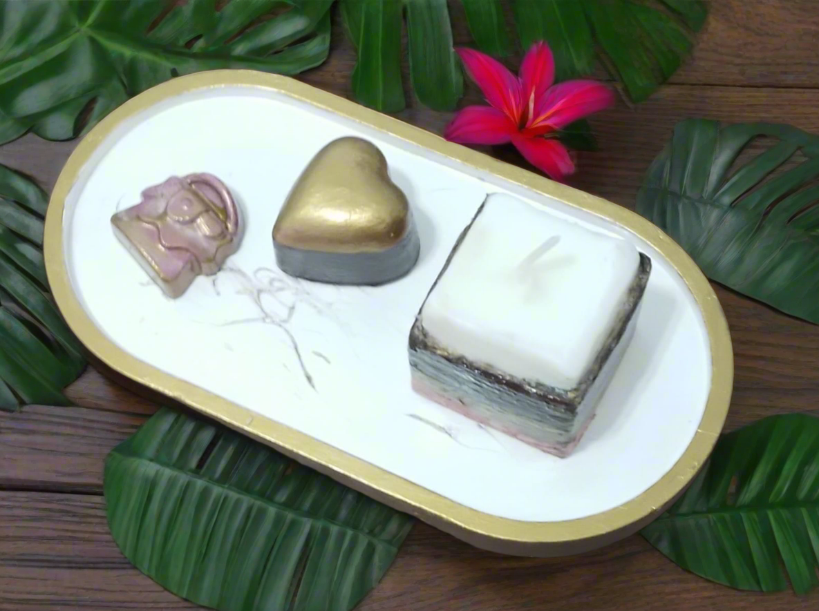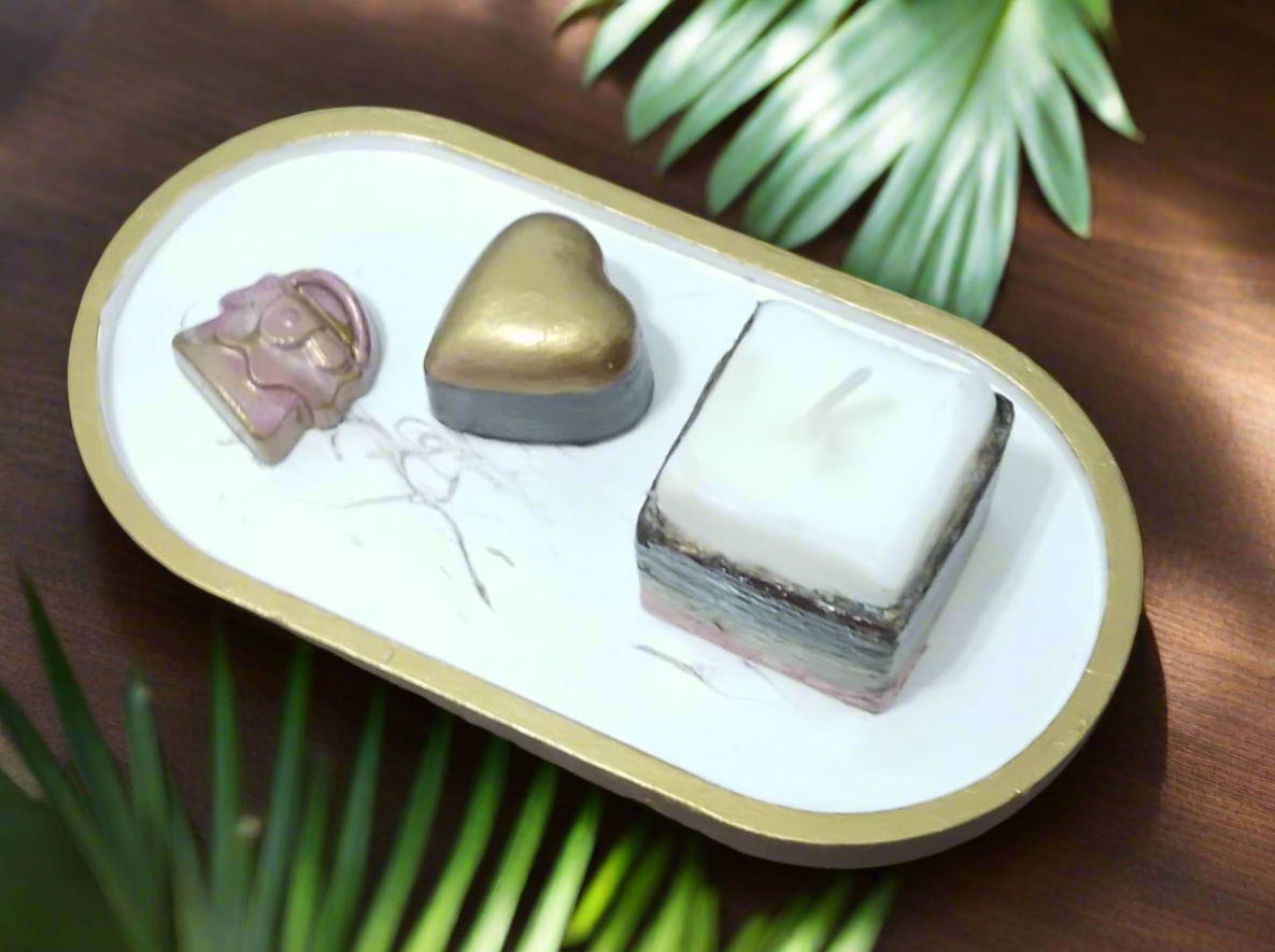 Todas as peças são de produção artesanal a base de pó de gesso. A bandeja teve a sua coloração feita diretamente no processo de moldagem, isto agrega mais resistência ao produto. O material da vela é composto por manteigas vegetais e óleos essenciais. Existe um simbolismo nos doces: a bolsinha (significa entrada de dinheiro) e o coração (atrai bons sentimentos, Amor).
