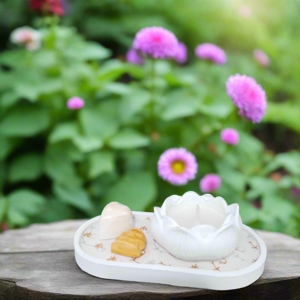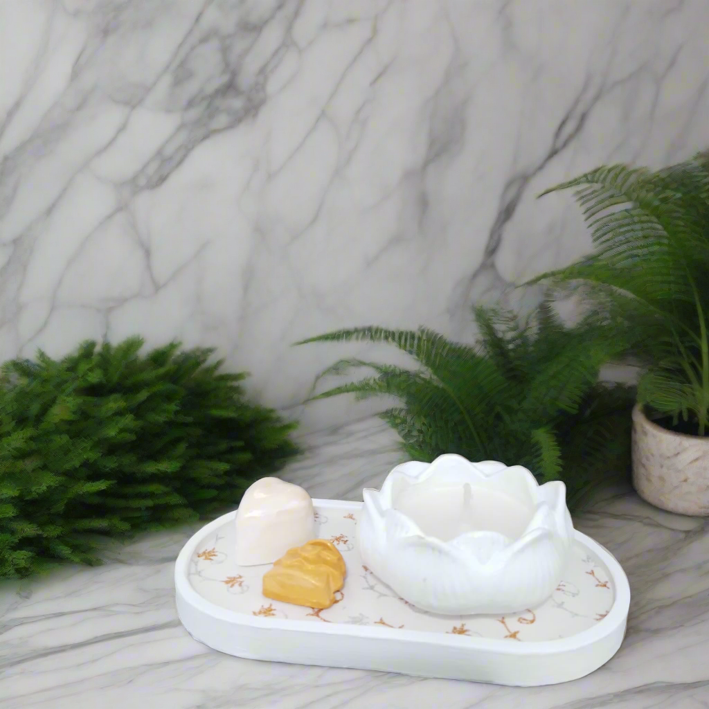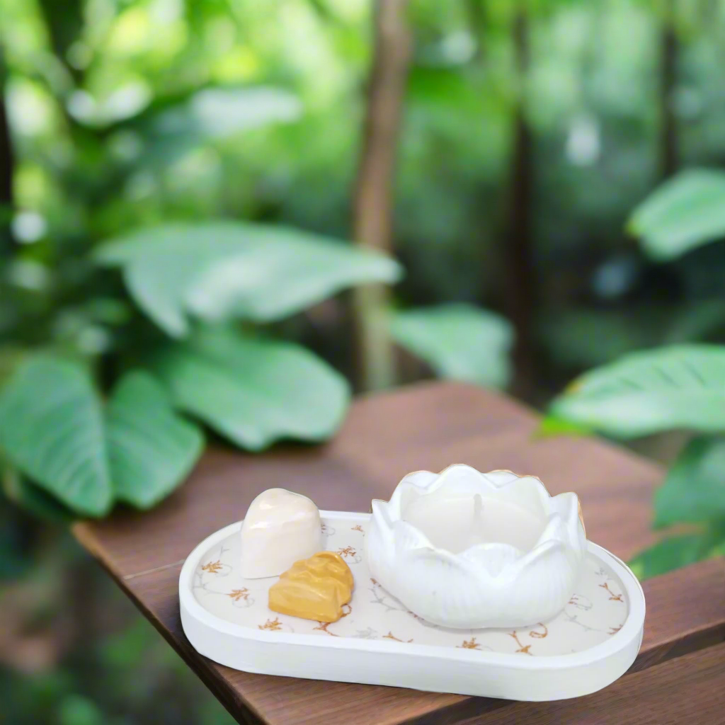 Pura magia e encantamento! As peças são todas artesanais e são compostas pela moldagem do gesso em pó. A combinação entre as forças: espiritual (vela), trabalho (bolsinha), Amor (coração) criam o ambiente perfeito para focar no sucesso, vencendo as incertezas e o medo de fracassar. A bandeja recebeu acabamento de seda, o qual conferiu à peça um estilo original.
