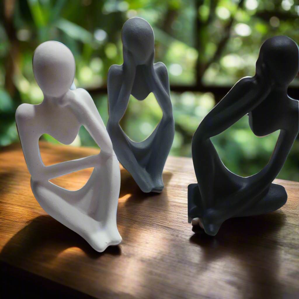 Conjunto de três esculturas em cimento, com design minimalista e moderno, perfeitas para decorar qualquer ambiente. As figuras representam uma pose pensativa, adicionando um toque de arte e sofisticação.